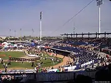 Peoria /piˈɔːriə/ is a city in Maricopa and Yavapai counties in the state of Arizona. Most of the city is located in Maricopa County while a tiny portion in the north is in Yavapai County. It is a major suburb of Phoenix. According to 2019 Census Bureau estimates, the population of the city is 175,961.[2] Peoria is currently the sixth-largest city in Arizona in land area and the ninth-largest in population. It was named after Peoria, Illinois. The word peoria is a corruption of the Miami-Illinois word for 'prairie fire'.[3][4] It is the spring training home of the San Diego Padres and Seattle Mariners, who share the Peoria Sports Complex.