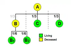 Example 1A: The testator A, specifies in his will that his estate is to be divided among his descendants in equal shares per stirpes. A has three children, B, C, and D. B is already dead, but has left two children (grandchildren of A), B1 and B2. When A's will is executed, under a distribution per stirpes, C and D each receive one-third of the estate, and B1 and B2 each receive one-sixth. B1 and B2 constitute one "branch" of the family, and collectively receive a share equal to the shares received by C and D as branches (figure 1).