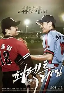 Perfect Game (Korean: 퍼펙트 게임; RR: Peopekteu Geim) is a 2011 South Korean film based on the true story of rivals Sun Dong-yeol of the Haitai Tigers and Choi Dong-won of the Lotte Giants, the top pitchers in the Korea Baseball Organization league during the 1980s.[2] The rivalry between the two was further heated up by regionalism at the time with Sun representing the Jeolla Province and Choi, the Gyeongsang Province.[3]