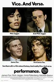Performance is a 1970 British crime drama film directed by Donald Cammell and Nicolas Roeg, written by Cammell and photographed by Roeg. The film stars James Fox as a violent and ambitious London gangster who, after killing an old friend, goes into hiding at the home of a reclusive rock star (Mick Jagger of The Rolling Stones).