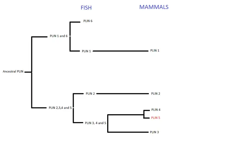 Perilipins are considered to have evolved from a common ancestral gene. This family began to split during the first and second vertebrate genome duplication,[9] giving birth to six types of PLIN genes, expressed throughout the animal kingdom. However, not all types are present in all animals. In fish, PLIN 1 to 6 can be found, whereas in mammals only PLIN1 to 5.[10]