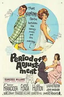 Period of Adjustment is a 1962 American comedy-drama film directed by George Roy Hill from a screenplay written by Isobel Lennart, based on Tennessee Williams' 1960 play of the same name and stars Anthony Franciosa, Jane Fonda, Jim Hutton, and Lois Nettleton. In the film; a newlywed couple on their honeymoon visit friends who are having marital problems of their own.