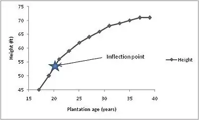 In forestry, periodic annual increment (PAI) is the change in the size of a tree between the beginning and ending of a growth period, divided by the number of years that was designated as the growing period.[1] For sigmoid growth, the graph of PAI increases rapidly and then quickly declines, approaching zero. PAI may go negative if a tree loses volume due to damage or disease. Periodic annual increment is commonly used instead of current annual increment as a basis for computing growth per cent. Growth per cent indicates the rate of increase with relation to the wood capital required for its production, this is usually based on a single year's growth.[2]