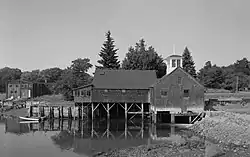 The Perkins Tide Mill was located on the north side of Kennebunkport village, on the northeast shore of Mill Stream, a tidal arm of the Kennebunk River. Its main building was an L-shaped wood-frame structure, set on wooden pilings and a rubblestone foundation. It had a cross-gabled roof, and was finished in wooden shingles. The mill interior housed a wide variety of equipment related to the history of its operation as a grist mill, including a waterwheel, grindstones, and gears and shafts. A dam, still partially in evidence, extended across Mill Stream, with a sluiceway near the building.[2]