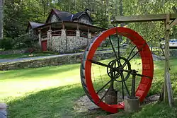At that time, the wormy chestnut wood from the restaurant walls was salvaged and used for the ceiling in the log house, the ceiling fan was placed on the porch of the log house, and the water wheel was moved from behind the restaurant up the hill to its current location. The water wheel was restored c. 1955 using red-painted plywood sides and aluminum buckets, and it was restored again in October 2012 with more historically accurate white oak sides and buckets.