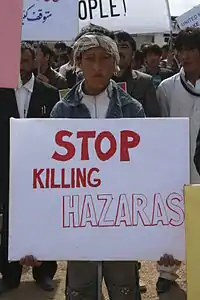 Various advocacy groups, such as the Hazara People International Network, have been formed to publicise the situation and promote opposition to it.[12] The Hazara diaspora in Australia, Western Europe and North America have also joined these protests from time to time.[13] Haji Mohammad Mohaqiq, the political leader of the Hazara in Afghanistan, has also expressed solidarity with the Hazara community in Quetta.[14][15]