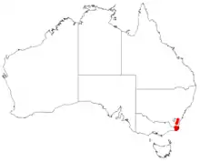 This geebung grows in eucalypt forest at altitudes between 200 and 1,100 m (660 and 3,610 ft) on a few peaks near the New South Wales–Victoria border and near the upper Genoa River in far eastern Victoria.[3][4][5]