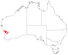 This geebung grows in woodland near salt lakes between the type location, Coomberdale, Lake Ninan (near Wongan Hills) and Kulja in the Avon Wheatbelt, Geraldton Sandplains and Swan Coastal Plain biogeographic regions.[3][5]