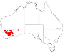 Persoonia coriacea is found in the southwest of Western Australia, from Carnamah southwards to Lake Grace and Lake King and east across to Plumridge Lakes. It grows on yellow sand dunes or sandplains, or on sandy clay soils, sometimes over laterite, red sand or granite and occurs in heathland and mallee heath plant communities.[3][5] The uncommon blue-breasted fairywren has been recorded using this shrub as a nest site.[10]