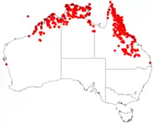 Persoonia falcata ranges across a broad swathe of northern Australia, generally within 300 km (190 mi) of the coastline.[7] In the northwest of Western Australia it is found in the Great Sandy Desert and vicinity of Broome,[9] eastwards across the Northern Territory into northern Queensland, with the Blackdown Tableland marking the southeastern limit of its range.[7]