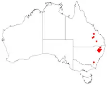 This geebung grows in woodland and forest on the Northern Tablelands between Glen Innes, the Moonbi Range and adjacent areas to the west, at altitudes between 800 and 1,200 m (2,600 and 3,900 ft).[2][3]