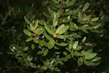 Persoonia laurina grows as a shrub with an upright or sprawling habit reaching anywhere from 0.2 to 2 metres (7+3⁄4 in to 6 ft 6+3⁄4 in) tall. New growth is covered with dense grey to rusty-brown hairs. Flowering takes place over November to January.[3] Seedlings have only two cotyledon leaves, unlike many members of the genus, which have more.[9]