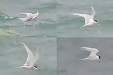 The Peruvian tern is a very small species with a length of about 24 cm (9.4 in).[2] The upper half of the head and neck are black, and the remaining part of the head is white. The back, wings and tail are grey, the throat, chin and breast are white, and the chest, belly and flanks are pale grey. The under tail-coverts are white. The bill is yellow with a black tip, the irises are brown and the legs are yellowish. The pale grey underparts differentiate it from other small terns. It has a very rapid and characteristic wingbeat. The call is a shrill "kik" and a harsh "gree", and it also utters a descending series of "kee-ee-eer" notes.[2]