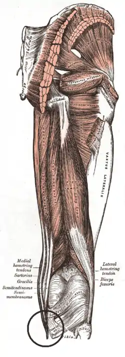 ![]() Muscles of the gluteal and posterior femoral regions. Area of pes anserinus is encircled at bottom. sartorius, gracilis, semitendinosus and semimembranosus are labeled at bottom left. | |