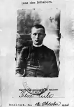 Šarić wanted to secure the state stipend for Čule.[19][20] Although his grades were satisfying, Čule also needed confirmation on the property status of his parents.[20] However, the bishop of Mostar-Duvno Alojzije Mišić intended to appoint him a parish priest in Blagaj, from where he expelled a local Franciscan for disorderly conduct and couldn't replace him with another Franciscan due to the opposition from the locals. The Provincial of the Herzegovinian Franciscans asked Mišić to find a diocesan priest for the task.[19][21] Čule was supposed to take the post on 8 September 1921. This endangered Čule's intention to continue his education.[22] However, the Provincial changed his mind, and proposed Mišić yet another Franciscan for the duty.[19] Mišić agreed to drop the appointment but still insisted to keep Čule as a parish priest or a chaplain. Nevertheless, Čule asked the bishop to send him for further education.[19][21] The time for the stipend already expired.[21] However, the rector of the Catholic Faculty of Theology in Sarajevo Antun Prešern managed to arrange a place for Čule at the Jesuit Collegium Canisianum in Innsbruck, Austria.[19][21] As he didn't manage to secure the stipend, Čule managed his financing by himself.[19] At the end of September 1921, Čule was in Innsbruck. The study system was the same as in Sarajevo, which suited Čule.[21] On 12 July 1912, Čule defended his doctoral thesis titled De statu hominis of St. Bonaventure and was given the title of doctor of theology. He finished his studied in Innsbruck with summa cum laude.[19][21]