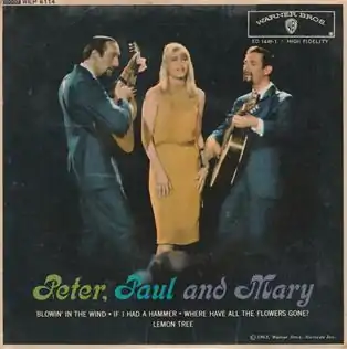 Peter, Paul and Mary (EP) was an EP 45 rpm record by the American folk trio Peter, Paul and Mary, released on Warner Brothers and Decca Records in the UK in 1963, WEP 6114, in mono. The record reached #3 in the British EP charts.[1]