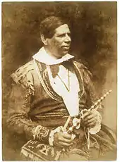 Jones travelled to Great Britain in 1845 for a third fundraising tour, giving speeches and sermons. Wherever he travelled, Jones drew huge crowds, but inwardly he was depressed. He felt the crowds were only there to see the exotic Indian Kahkewāquonāby and his native costume, and did not appreciate all the work he had put into becoming a good Christian. Despite his misgivings about the trip, he raised £1000, about two thirds of that total in Scotland, and one third in England.[66] On August 4, 1845 in Edinburgh Jones was photographed by Robert Adamson and David Octavius Hill. These were the first photographs taken of a North American Indian.[33][65]