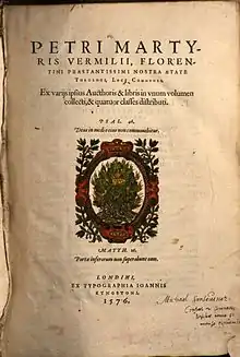 Peter Martyr Vermigli[lower-alpha 2] (8 September 1499 – 12 November 1562) was an Italian-born Calvinist theologian. His early work as a reformer in Catholic Italy and his decision to flee for Protestant northern Europe influenced many other Italians to convert and flee as well. In England, he influenced the Edwardian Reformation, including the Eucharistic service of the 1552 Book of Common Prayer. He was considered an authority on the Eucharist among the Calvinist churches, and engaged in controversies on the subject by writing treatises. Vermigli's Loci Communes, a compilation of excerpts from his biblical commentaries organised by the topics of systematic theology, became a standard Calvinist theological textbook.