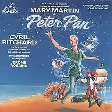 The musical premiered at the Curran Theatre in San Francisco on July 19, 1954. The initial four-week run was followed by an eight-week engagement in Los Angeles.[5] The show opened on Broadway on October 20, 1954 at the Winter Garden Theatre for a planned limited run of 152 performances.[6] The busy 1954 Broadway season also included The Boy Friend, Fanny, Silk Stockings and Damn Yankees. While still in tryouts, a deal was made for Peter Pan to be broadcast on the NBC anthology series Producers' Showcase on March 7, 1955, which ensured that it was a financial success despite the limited run. The revised score and Tony Award-winning performances by Martin and Cyril Ritchard, as Captain Hook, made the musical a critical success, and tickets sold out throughout the Broadway run. The show closed on February 26, 1955 to prepare for the television broadcast.[3][7]
