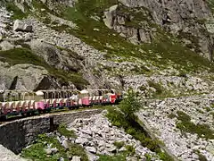 The Petit train d'Artouste is a narrow gauge tourist railway situated in the French Pyrenees close to the Spanish border, some 55 km (34.2 mi) south of the town of Pau, and within the commune of Laruns. The line runs high above the headwaters of the Gave d'Ossau, and provides access to the Lac d'Artouste, a semi-artificial lake in the mountains at an altitude of nearly 2,000 m (6,562 ft).[1] It is the second-highest railway in France after the Tramway du Mont-Blanc.