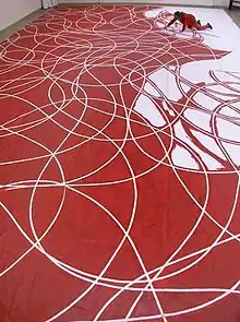 Since 1993 Petr Kvíčala has created a number of ephemeral installations – mostly on the floors of galleries and in public space. Major installations are e.g. send lines in Plasy convent (1993), the red pigment installation in Behémot gallery in Prague (1994) or contemporary Zig Zag street art in Brno (2009).