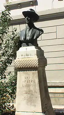 In autumn 1911, Liciu developed nephritis; he would die of the disease the following spring, shortly after turning 41.[4] Four years later, a bust of the actor was unveiled before the Maior Gheorghe Pastia Municipal Theatre in his hometown; it was Romania’s first statue of an actor in a public square.[5]