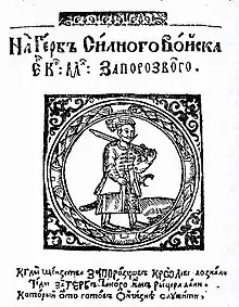 Petro Konashevych-Sahaidachny (Ukrainian: Петро Конашевич-Сагайдачний; Polish: Piotr Konaszewicz-Sahajdaczny; born about 1582[2] in Kulchytsi, today Sambir Raion – April 20, 1622 in Kyiv) was a Ukrainian political and civic leader, Hetman of Ukrainian Zaporozhian Cossacks from 1616 to 1622,[2] a military leader of Polish–Lithuanian Commonwealth both on land and sea. While being a Cossack Hetman, he transformed the Cossack Host from an irregular military formation into a regular army. Under his leadership, the cossacks, the Orthodox clergy and peasants began to emerge as a united nation. His troops played a significant role in the Battle of Khotyn against the Turks in 1621 and Polish Prince Władysław's attempt to gain the throne of Russia in 1618.[3]