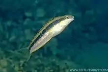 Petroscirtes lupus, the wolf fangbelly, is a species of combtooth blenny found in coral reefs in the western Pacific ocean. This species reaches a length of 13 centimetres (5.1 in) TL.[2] A variably greyish, brown or greenish blenny with six large dark blotches, white dots and dashes on upper sides, and dark dots below. It has two large canines in the lower jaw which are used for defence, although this species is not venomous, and they have been known to bite if handled.[3] They live among sea grass beds, seaweed or the empty shells of molluscs. The female lays her eggs on the interior of a mollusc shell and the male guards them.[2]