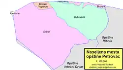 Petrovac is a rural municipality, consisting of villages Bunara, Drinić and Podsrnetica and parts of Bravski Vaganac, Bukovača and Klenovac.[2] It is located between municipalities of Bosanski Petrovac in the north and west, Ribnik and Istočni Drvar in the east, and Drvar in the south. The total area of the municipality is 137 km2, about a sixth of 853 km2 of the pre-war municipality.