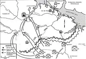 The offensive can be divided into three phases: the breakthrough of the German position, the pursuit to Kirkenes, and the battle for Kirkenes, including the southward pursuit that followed it. During the offensive several amphibious landings were conducted by naval infantry and army units.[5] Initially, the Germans' intended withdrawal was hampered by Hitler's strict orders to Rendulic to evacuate all supplies from the Petsamo region before abandoning it.[6]