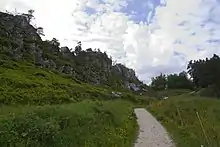 The Pfahl begins in the northwest in the Upper Palatinate, southeast of Schwarzenfeld, passes the town of Cham to the southwest and runs in a southeasterly direction via Viechtach, Regen, Grafenau and Freyung and into Upper Austria's Mühlviertel. The quartz only outcrops in a few places (and not at all southeast of Freyung);[5] otherwise the Pfahl is only recognisable as a ridge. In Weißenstein near Regen it reaches a height of 758 metres above sea level; on this summit stand the ruins of Weißenstein Castle. The quartz formations are most easily visible near Viechtach (west of the town) and here they rise up to 30 metres above the ground. With a few exceptions the Pfahl has survived as a continuous geological formation.
