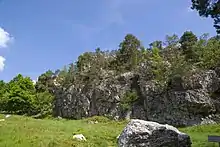 The Pfahl consists of quartz that was deposited as a hydrothermal vein about 275 million years ago within the existing fault structure.[1] The Pfahl was probably active as a fault several times. Because the rock of the Pfahl was harder than the surrounding rock, it was left standing like a wall as softer rocks were eroded. Today the Pfahl forms a residual ridge 150 kilometres long and 10 to 40 metres high. The shining white quartz of the Pfahl consists of up to 98% silicic acid; any yellowish to reddish or grey coloration is caused by iron compounds and impurities (Pfahlschiefer). The interpretation of the actual Pfahl fault as a suture is disputed; but it has been confirmed that it separates various magmatic rocks.[2][3][4]