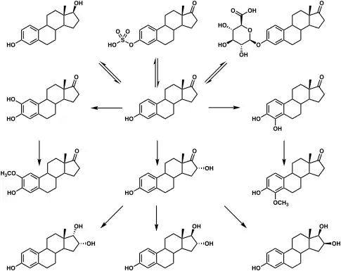 When taken orally, about 95% of a dose of estradiol is metabolized in the intestines and liver into estrone and estrogen conjugates such as estrone sulfate, estrone glucuronide, and estradiol sulfate, among others, prior to entering the circulation.[3][86][87][88] As a result, circulating estrone and estrogen conjugate levels are markedly elevated, in a highly unphysiological manner, with oral estradiol.[86][89] Whereas the ratio of circulating estradiol to estrone is about 1:1 in premenopausal women and with transdermal estradiol, oral estradiol produces a ratio of about 1:5 on average and as high as 1:20 in some women.[1][10][90][58] In addition, whereas levels of estradiol with menopausal replacement dosages of oral estradiol are in the range of the follicular phase of the normal menstrual cycle, levels of estrone resemble those during the first trimester of pregnancy.[91][92] Moreover, whereas normal physiological estrone sulfate levels are 10 to 25 times higher than those of estradiol and estrone in premenopausal women,[93] levels of estrone sulfate with oral estradiol are an additional 8 to 20 times higher than normal premenopausal or postmenopausal estrone sulfate levels.[89][94][95] One study found that estrone sulfate levels were 200-fold higher than estradiol levels with 2 mg/day oral micronized estradiol or oral estradiol valerate, and estrone sulfate levels can reach up to nearly 1,000-fold higher concentrations than estradiol in some cases.[10][12] In contrast to oral estradiol, due to the lack of the first pass, an excess in estrone and estrogen conjugate levels does not occur with transdermal estradiol or other parenteral estradiol routes.[86][89]
