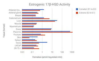 On the other hand, it has been suggested by some authors that the high levels of estrone and/or estrone conjugates with oral estradiol may result in excessive estradiol levels in certain tissues such as the breasts and endometrium, due to high expression in these tissues of the requisite enzymes (17β-HSDs and STS) necessary to transform these metabolites back into estradiol.[92][89][108][109] In accordance, circulating levels of estrone sulfate have been found to be positively associated with breast density in postmenopausal women treated with oral estradiol, with 1.3% higher breast density observed for every 1 ng/mL greater level of estrone sulfate.[110][111] Similarly, levels of estradiol, estrone, and estrone sulfate are all strongly associated with the risk of breast cancer in women.[110] Preclinical studies have shown that estrone sulfate, via local transformation into estradiol, stimulates the growth of mammary cancer cells.[112][113]