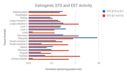 The transformation of estradiol into estrone and estrogen conjugates is reversible.[10] As such, these metabolites can be converted back into estradiol.[10] About 15% of orally administered estradiol is transformed into estrone and 65% into estrone sulfate.[12] About 5% of estrone and 1.4% of estrone sulfate is converted back into estradiol.[12] An additional 21% of estrone sulfate is converted into estrone, whereas transformation of estrone into estrone sulfate is approximately 54%.[12] The interconversion between estradiol and estrone is mediated by 17β-hydroxysteroid dehydrogenases (17β-HSDs),[12] whereas the conversion of estrone into estrone sulfate is mediated by estrogen sulfotransferases (ESTs) and the transformation of estrone sulfate into estrone by steroid sulfatase (STS).[96][97] The metabolic clearance rates and hence blood half-lives of estrogen conjugates like estrone sulfate are much longer than those of estradiol and estrone.[10][12][89] Estrogen conjugates, primarily estrone sulfate, serve as a large circulating reservoir for estradiol, and because of this, they function to greatly extend the biological half-life of oral estradiol.[10][12] As such, the biological half-life of oral estradiol is a composite parameter that is dependent on interconversion between estradiol and estrogen conjugates, as well as on enterohepatic recirculation.[12] Whereas the biological half-life of estradiol given by intravenous injection is about 0.5 to 2 hours, the biological half-life of oral estradiol has a range of 13 to 20 hours due to the large and long-lasting pool of estrogen conjugates that is formed during first-pass metabolism and that serves to continuously replenish circulating estradiol levels.[12][10][9]