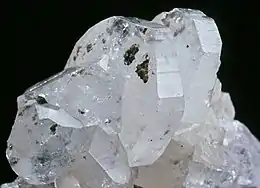 Phenakite or phenacite is a fairly rare nesosilicate mineral consisting of beryllium orthosilicate, Be2SiO4. Occasionally used as a gemstone, phenakite occurs as isolated crystals, which are rhombohedral with parallel-faced hemihedrism, and are either lenticular or prismatic in habit: the lenticular habit is determined by the development of faces of several obtuse rhombohedra and the absence of prism faces. There is no cleavage, and the fracture is conchoidal. The Mohs hardness is high, being 7.5 – 8; the specific gravity is 2.96. The crystals are sometimes perfectly colorless and transparent, but more often they are greyish or yellowish and only translucent; occasionally they are pale rose-red. In general appearance the mineral is not unlike quartz, for which indeed it has been mistaken.[5] Its name comes from Ancient Greek: φέναξ, romanized: phénax, meaning "deceiver" due to its close visual similarity to quartz,[6] named by Nils Gustaf Nordenskiöld in 1833.[3][5]