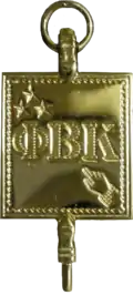 The "key" of Phi Beta Kappa did not begin as a copy of a watchkey. The first insignia was in fact a larger, cut-and-engraved silver medallion, essentially a square of metal with a loop cut integrally with the body of the square from the same sheet of silver, in order to allow for suspension from one or two ribbons worn around the member's neck in the manner in which the older fraternities (and the Masonic bodies on which the collegiate societies were in part patterned) wore their own insignia.[21] Later, the size of the medallion was reduced and men took to wearing the insignia on their watch chains as fobs.