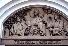 The altarpiece is a painting in a gilt carved frame by Danish artist Erik Jensen (1883-1974). The pulpit has gospel reliefs by M. Sørensen. Above the west entrance is a tympanon relief designed by Johan Rudolf Carl Nielsen (1863-1952). The inscription quoting the words of Philip the Apostle to Nathanael in John 1:45: "Come and see".[2] [3]