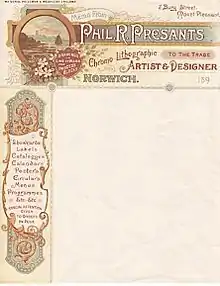 Philip was involved with the Canterbury Jubilee Exhibition of 1900–1901 for which he designed the certificates, including an award presented to T.J. Edmonds, later known for the Edmonds Cookery Book. Oral tradition records that Presants was the designer of the cover of the iconic second edition of the cookery book, published in 1910.[11] Presants had a larger role in the organisation of the International Exhibition (1906) in Christchurch. He served as a member of the Decorative Committee[12] and the Fine Arts Committee.[13] Presants prepared the watercolour illustrations for the exhibition booklet, available for inspection at the Alexander Turnbull Library.[14] He also exhibited some of his own work as a graphic artist.[15]