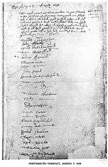 Scores of the followers of Wheelwright and Hutchinson were ordered out of the Massachusetts colony, but before leaving, a group of them, including Sherman, signed what is sometimes called the Portsmouth Compact, establishing a non-sectarian civil government upon the universal consent of the inhabitants, with a Christian focus.[4] Planning initially to settle in New Netherland, the group was persuaded by Roger Williams to purchase some land of the Indians on the Narragansett Bay. They settled on the north east end of Aquidneck Island, and established a settlement they called Pocasset, but in 1639 changed the name to Portsmouth.[5] William Coddington was elected the first judge (governor) of the settlement.[6]