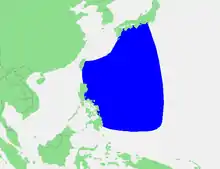 The Philippine Sea is a marginal sea of the Western Pacific Ocean east of the Philippine archipelago (hence the name), the largest in the world, occupying an estimated surface area of 5 million square kilometers (2×106 sq mi).[1] The Philippine Sea Plate forms the floor of the sea.[2] Its western border is the first island chain to the west, comprising the Ryukyu Islands in the northwest and Taiwan in the west. Its southwestern border comprises the Philippine islands of Luzon, Catanduanes, Samar, Leyte, and Mindanao. Its northern border comprises the Japanese islands of Honshu, Shikoku and Kyūshū. Its eastern border is the second island chain to the west, comprising the Bonin Islands and Iwo Jima in the northeast, the Mariana Islands (including Guam, Saipan, and Tinian) in the due east, and Halmahera, Palau, Yap and Ulithi (of the Caroline Islands) in the southeast. Its southern border is Indonesia's Morotai Island.[3]