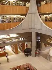 A circular double staircase built from concrete and faced with travertine greets the visitor upon entry into the library. At the top of the stairs the visitor enters a dramatic central hall with enormous circular openings that reveal several floors of book stacks. At the top of the atrium, two massive concrete cross beams diffuse the light entering from the clerestory windows.