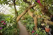 The Fern Room is located in the west wing at the intersection of the Serpentine Room, the Orchid Room, and the Stove Room.[16] The room contains many ferns, as well as cycads and other ground plants on which ferns commonly grow. The dominant species in the room are representative of the Triassic, during which ferns and cycads were common as flowering plants would not evolve until millennia later. Some species include Munch's cycad, Eastern Cape cycad, Zululand cycad, Queen sago, Staghorn fern, Australian tree fern, Tasmanian tree fern, tongue fern, bear's paw fern, and rabbit foot's fern.[17]