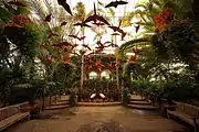 The Palm Court is the first room visitors see after entering the Conservatory through the main entrance. The Victorian-inspired room contains many species of palm trees.[12] The room contains the original dated plaque from the Conservatory's opening as well as numerous glass installations by Dale Chihuly. To accommodate the palm trees, the Palm Court has a high glass peak.