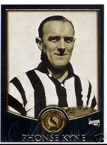 Alphonsus Edward "Phonse" Kyne (29 October 1915 – 8 April 1985) was an Australian rules footballer who played for and coached Collingwood in the Victorian Football League. He is an inductee of the Australian Football Hall of Fame and a member of the official Collingwood Team of the Century. Along with Allan La Fontaine (Melbourne Football Club), he is widely regarded as one of the two best footballers to graduate from St Kevin's College, Toorak.