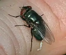 Phormia regina adults are metallic blue or green in color and have a distinctive set of orange setae near the anterior thoracic spiracle.[2] They are also recognizable by their black gena (the side of the head below eye level), mostly white calypteres, and the distinctive bend in their wings.[2][3]