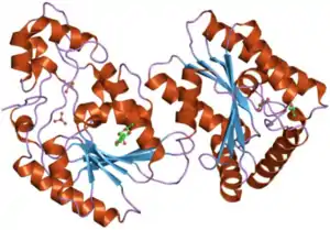 Phosphofructokinase-2 (6-phosphofructo-2-kinase, PFK-2) or fructose bisphosphatase-2 (FBPase-2), is an enzyme indirectly responsible for regulating the rates of glycolysis and gluconeogenesis in cells. It catalyzes formation and degradation of a significant allosteric regulator, fructose-2,6-bisphosphate (Fru-2,6-P2) from substrate fructose-6-phosphate. Fru-2,6-P2 contributes to the rate-determining step of glycolysis as it activates enzyme phosphofructokinase 1 in the glycolysis pathway, and inhibits fructose-1,6-bisphosphatase 1 in gluconeogenesis.[1] Since Fru-2,6-P2 differentially regulates glycolysis and gluconeogenesis, it can act as a key signal to switch between the opposing pathways.[1] Because PFK-2 produces Fru-2,6-P2 in response to hormonal signaling, metabolism can be more sensitively and efficiently controlled to align with the organism's glycolytic needs.[2] This enzyme participates in fructose and mannose metabolism. The enzyme is important in the regulation of hepatic carbohydrate metabolism and is found in greatest quantities in the liver, kidney and heart. In mammals, several genes often encode different isoforms, each of which differs in its tissue distribution and enzymatic activity.[3] The family described here bears a resemblance to the ATP-driven phospho-fructokinases, however, they share little sequence similarity, although a few residues seem key to their interaction with fructose 6-phosphate.[4]