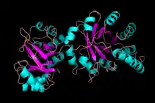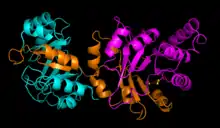 Depending on the microorganism PRAI's structure can vary between a mono-functional enzyme (monomeric and labile) or a stable bi-functional dimeric enzyme. Within Saccharomyces cerevisiae, Bacillus subtilis, Pseudomonas putida, and Acinetobacter calcoaceticus the enzyme is monmeric.[7] In contrast, in hyperthermophile Thermotoga maritima, Escherichia coli (Fig. 5), Salmonella typhimurium, and Aerobacter aerogenes, and Serratia marcescens, it is a bi-functional enzyme with indoleglycerol phosphate synthase as the paired enzyme.[8]