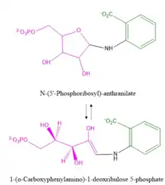 As seen in Fig. 3, N-(5'-phosphoribosyl)-anthranilate via this enzyme is converted into 1-(o-carboxyphenylamino)-1-deoxribulose 5-phosphate. As the name phosphoribosylanthranilate isomerase suggests, it functions as an isomerase, rearranging the parts of the molecule without adding or removing molecules or atoms.
