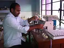 In principle, it is a controlled flame test with the intensity of the flame color quantified by photoelectric circuitry. The intensity of the colour will depend on the energy that had been absorbed by the atoms that was sufficient to vaporise them. The sample is introduced to the flame at a constant rate. Filters select which colours the photometer detects and exclude the influence of other ions. Before use, the device requires calibration with a series of standard solutions of the ion to be tested.